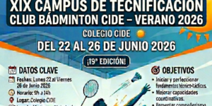 06.03.2026 Del 7 al 10 de Abril se celebrará el CAMPUS DE TECNIFICACIÓN CLUB BÁDMINTON CIDE – PASCUA 2026 en las instalaciones del Colegio CIDE. Con su 18ª edición ,...