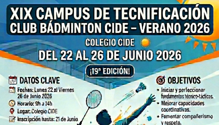 06.03.2026 Del 7 al 10 de Abril se celebrará el CAMPUS DE TECNIFICACIÓN CLUB BÁDMINTON CIDE – PASCUA 2026 en las instalaciones del Colegio CIDE. Con su 18ª edición , el CB CIDE realizará su Campus de Tecnificación, durante la semana de Pascua. OBJETIVOS del CAMPUS – Iniciar, aprender y perfeccionar los fundamentos técnicos y tácticos […]